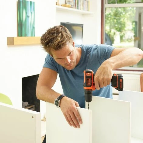Alimentée par une batterie 10.8 V de 1,5 Ah, la perceuse sans fil 10.8 V BDCDD12K1B-QW BLACK+DECKER est un outil profitant d’une bonne autonomie grâce à la technologie Lithium de sa batterie qui empêche l’effet mémoire et réduit l’autodécharge. Avec sa batterie Lithium, cette perceuse-visseuse conserve également jusqu’à 80 % de sa charge même si elle n’est pas utilisée sur une période de 90 jours. Il n’est donc pas nécessaire de la recharger avant chaque utilisation. Proposant un couple de serrage maximal de 26 Nm et 10 réglages du couple, c’est une perceuse-visseuse polyvalente et performante qui permet de réaliser la plupart des tâches de bricolage du quotidien avec précision. Equipée d’un mandrin 10 mm s’utilisant à 2 mains, elle peut percer jusqu’à 20 mm dans le bois et jusqu’à 10 mm dans le métal. La perceuse sans fil 10.8 V BDCDD12K1B-QW BLACK+DECKER est idéal pour ceux qui recherchent un outil pratique : il renvoie un faisceau LED pour offrir une bonne visibilité sur la zone de travail et fonctionne avec une batterie Slide Pack qui a l’avantage de pouvoir être retirée et réinsérée rapidement. La batterie Slide Pack assure également une bonne stabilité à la perceuse. La vitesse de la BDCDD12K1B-QW est facilement réglable de 0 à 550 tours/minute à la gâchette. Son moteur et sa batterie compacts en font une perceuse légère et maniable. Et pour un confort d’utilisation optimal, elle est dotée d’une poignée en bi-matière à revêtement Grip.La perceuse BDCDD12K1B-QW est livrée en coffret avec deux batteries Lithium 10,8 V de 1,5 Ah et un chargeur rapide.;;